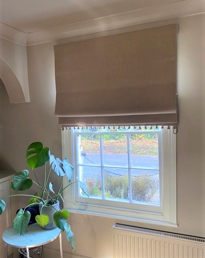 Following a design consultation, Roman blinds are handsewn, using traditional sewing techniques. I only use high quality, professional linings and components. Roman Blinds have no visible stitch lines to the front and rod pockets are created within the lining of the blind. Cords are held in place with traditional brass rings.